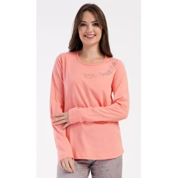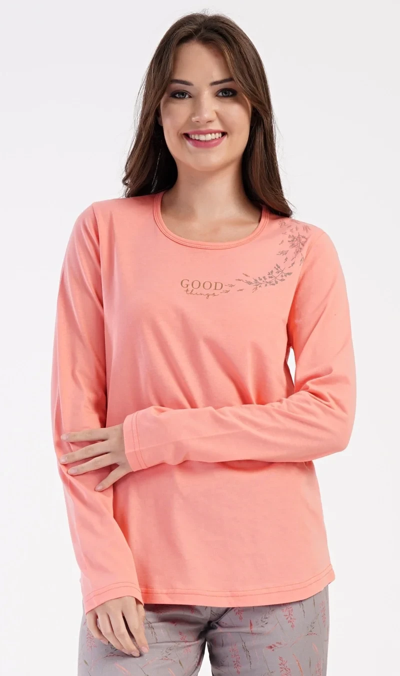 Dámské bavlněné dlouhé pyžamo Good things. Dámské pyžamo se skládá z trika s dlouhým rukávem a dlouhých kalhot. Triko je jednobarevné, zdobené menším obrázkem a nápisem 'Good things'. Kalhoty mají v pase gumu a šňůrku na stažení, nemají kapsy. Použitý bavlněný materiál je poddajný a příjemný na dotek.