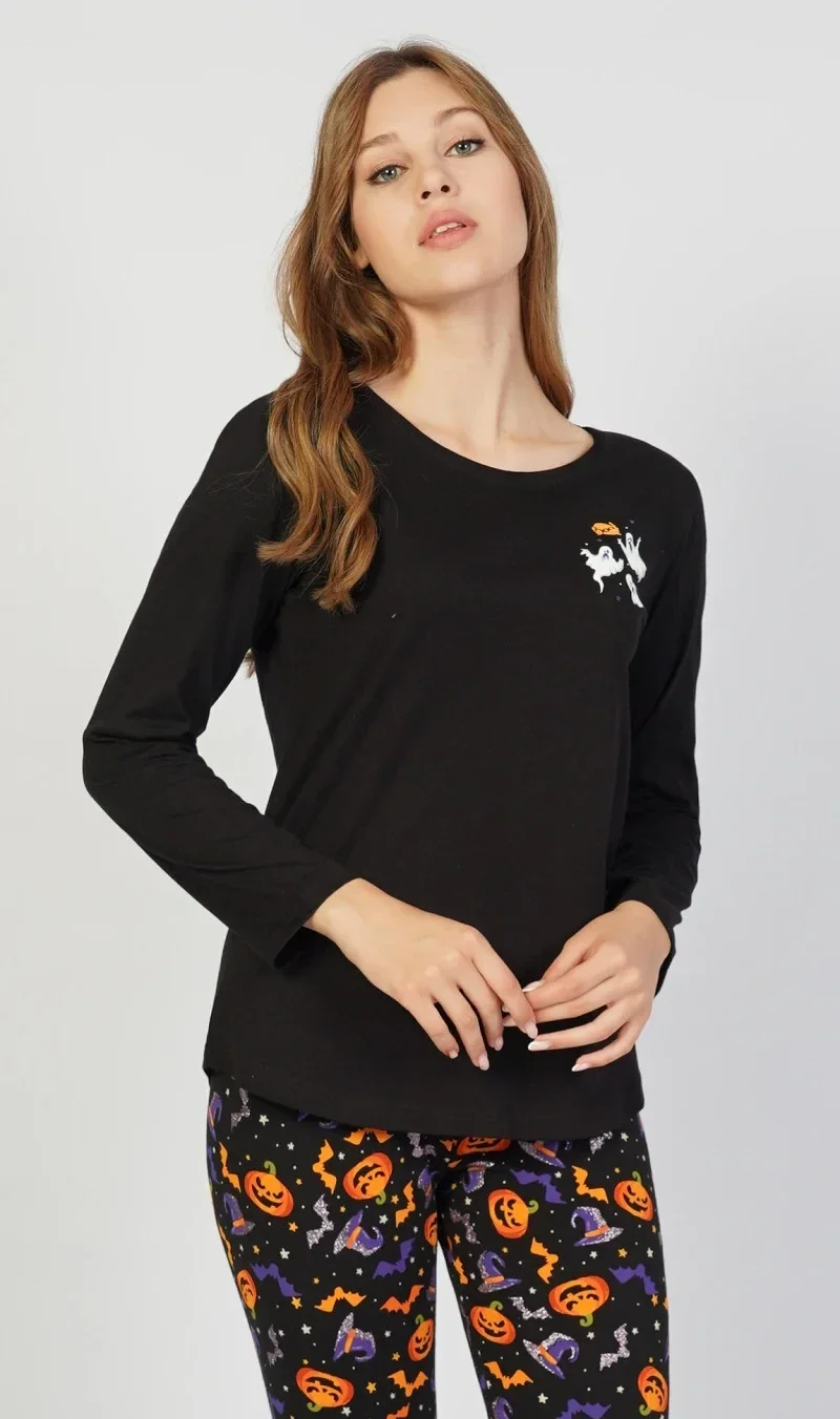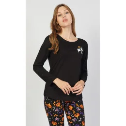Dámské pyžamo dlouhé Halloween. Dámské pyžamo se skládá z trika s dlouhým rukávem a dlouhých kalhot. Na triku je malý obázek s halloweenskými motivy, které se opakují i na dlouhých kalhotách. Kalhoty mají gumu a šňůrku na stáhnutí, nemají kapsy. Použitý bavlněný materiál je poddajný a příjemný na dotek.