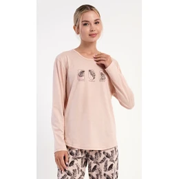 Dámské bavlněné dlouhé pyžamo Isabela. Dámské pyžamo se skládá z trika s dlouhým rukávem a dlouhých kalhot. Triko s výstřihem do V je na hrudi zdobeno obrázky větviček a drobným nápisem. Motiv větviček se opakuje i na kalhotách, které mají v pase gumu a šňůrku na stažení, nemají kapsy. Použitý bavlněný materiál je poddajný a příjemný na dotek.