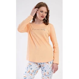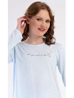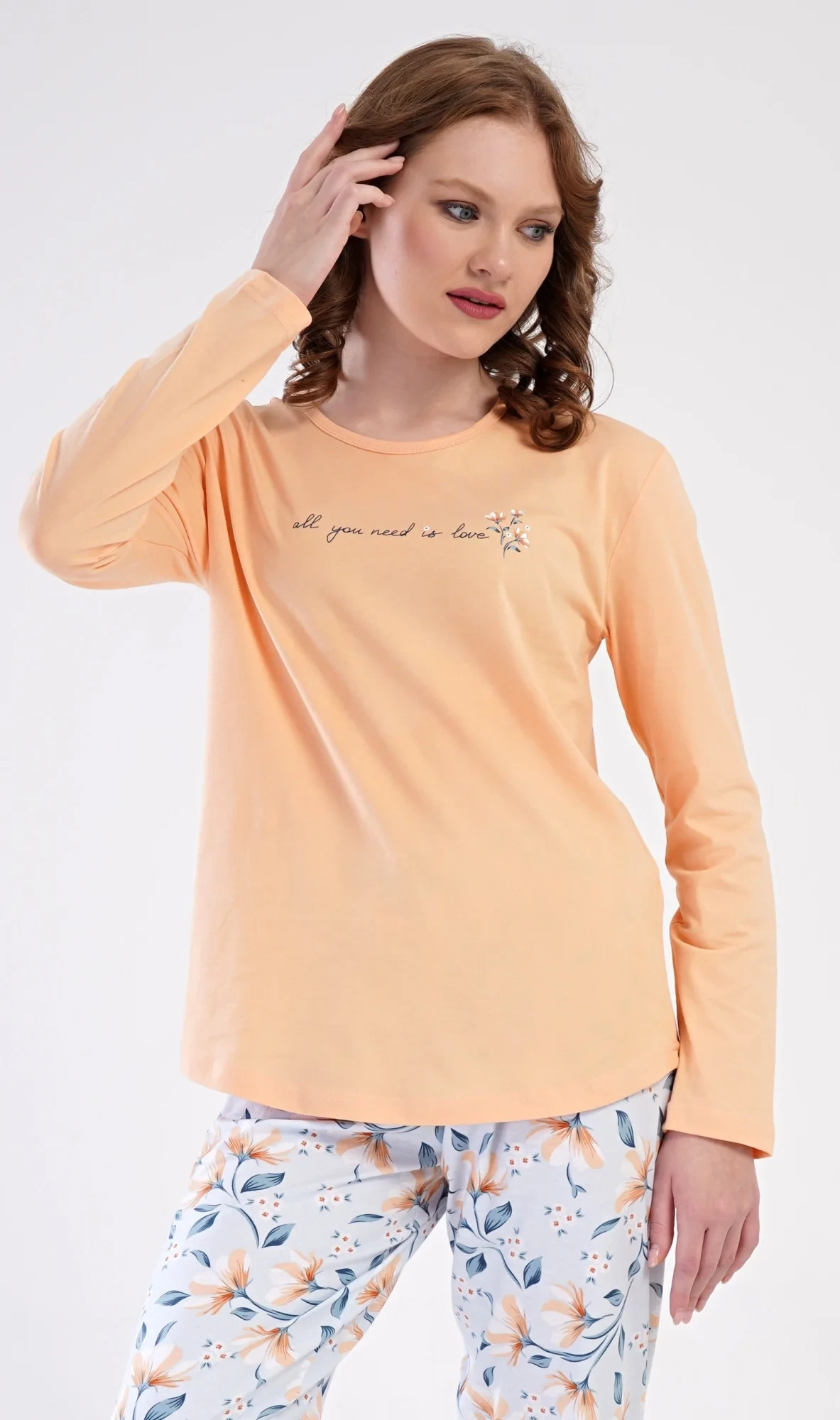 Dámské bavlněné dlouhé pyžamo Karolína. Dámské pyžamo se skládá z trika s dlouhým rukávem a dlouhých kalhot. Triko je jednobarevné, zdobené obrázkem drobných květů a nápisem 'all you need is love'. Květinový motiv se opakuje i na kalhotách, které mají v pase gumu a šňůrku na stažení, nemají kapsy. Použitý bavlněný materiál je poddajný a příjemný na dotek.