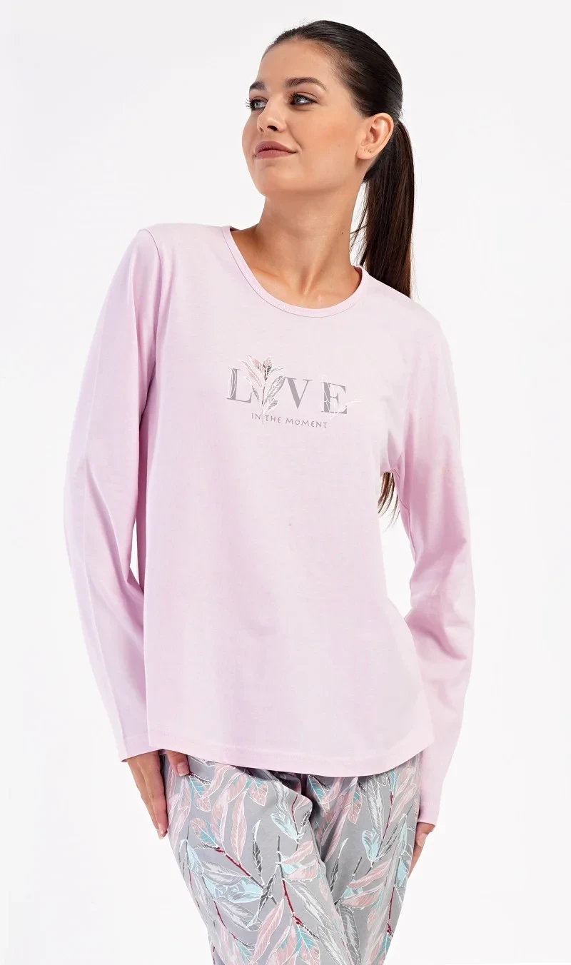 Dámské bavlněné dlouhé pyžamo Kika. Dámské pyžamo se skládá z trika s dlouhým rukávem a dlouhých kalhot. Triko je jednobarevné, zdobené obrázkem větvičky a nápisem 'Live in the moment'. Potisk větviček a listů se opakuje i na kalhotách, které mají v pase gumu a šňůrku na stažení, nemají kapsy. Použitý bavlněný materiál je poddajný a příjemný na dotek.