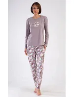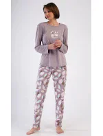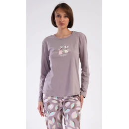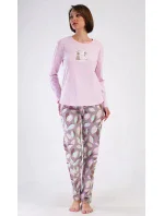 Dámské bavlněné dlouhé pyžamo Klárka. Dámské pyžamo se skládá z trika s dlouhým rukávem a dlouhých kalhot. Triko je jednobarevné, zdobené obrázkem květin v květináči. Květinový motiv se opakuje i na kalhotách, které mají v pase gumu a šňůrku na stažení, nemají kapsy. Použitý bavlněný materiál je poddajný a příjemný na dotek.
