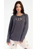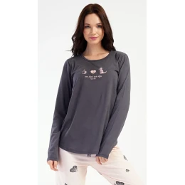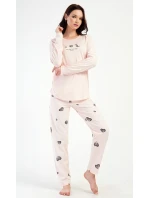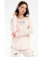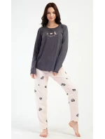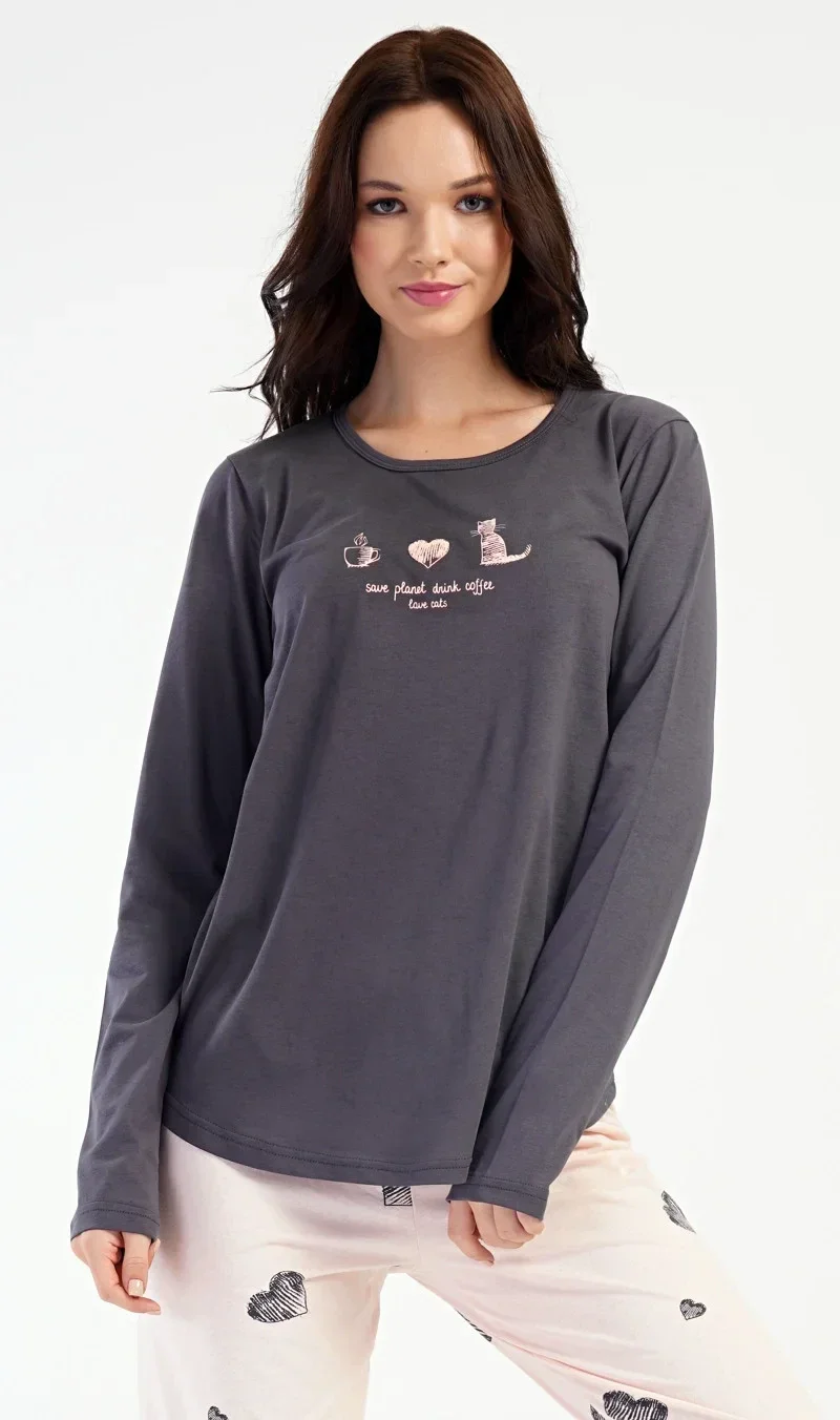 Dámské bavlněné dlouhé pyžamo Kočka. Dámské pyžamo se skládá z trika s dlouhým rukávem a dlouhých kalhot. Triko je jednobarevné, zdobené obrázkem šálku kávy, kočky a srdce. Potisk srdíček se opakuje i na kalhotách, které mají v pase gumu a šňůrku na stažení, nemají kapsy. Použitý bavlněný materiál je poddajný a příjemný na dotek.