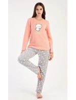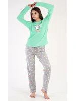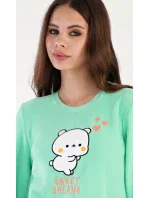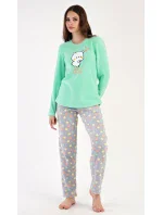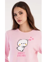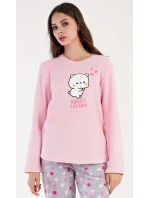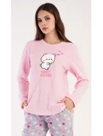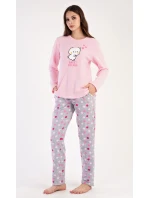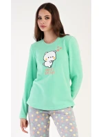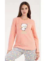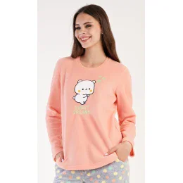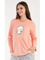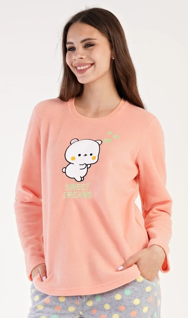 Dámské polarové dlouhé pyžamo Kotě. Dámské pyžamo se skládá z trika s dlouhým rukávem a dlouhých kalhot. Triko je ozdobené aplikací - obrázkem koťátka a nápisem SWEET DREAMS. Polarový materiál je hřejivý a hebký na dotek. Vzorované kalhoty jsou do gumy, mají šňůrku na stažení a praktické kapsy, také jsou vyrobeny z polaru. Toto pyžamko je díky hřejivosti vhodné i jako domácí oblečení pro chladné dny.