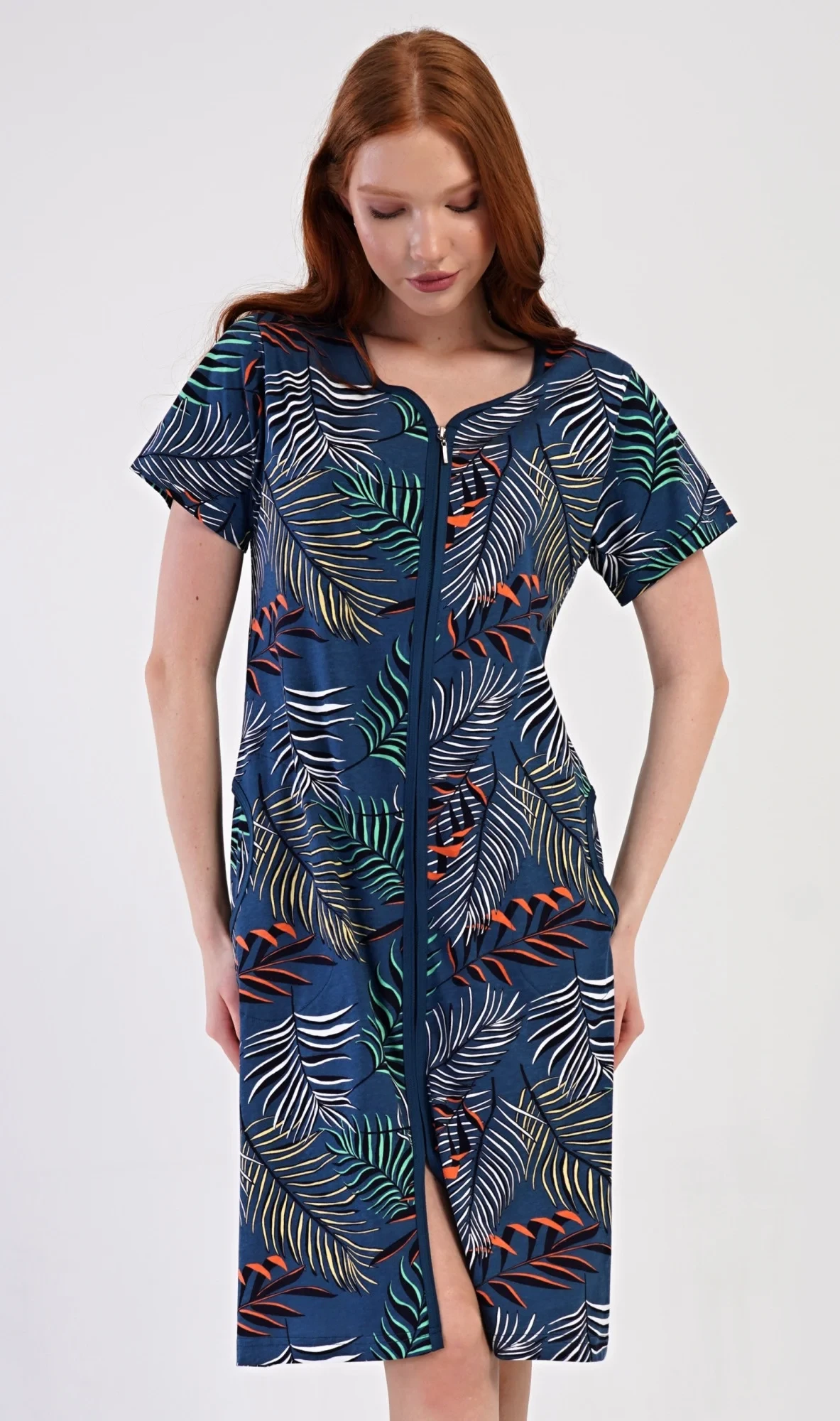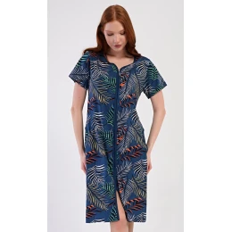 Dámské bavlněné domácí šaty s krátkým rukávem Barbara. Pohodlné rozepínací šaty v příjemné délce pod kolena využijete téměř při všech volnočasových aktivitách. Mají praktické kapsy a zapínání na zip. Tmavě modré šaty jsou potištěny pestrobarevnými větvičkami. Použitý bavlněný materiál je příjemný a poddajný na dotek.
