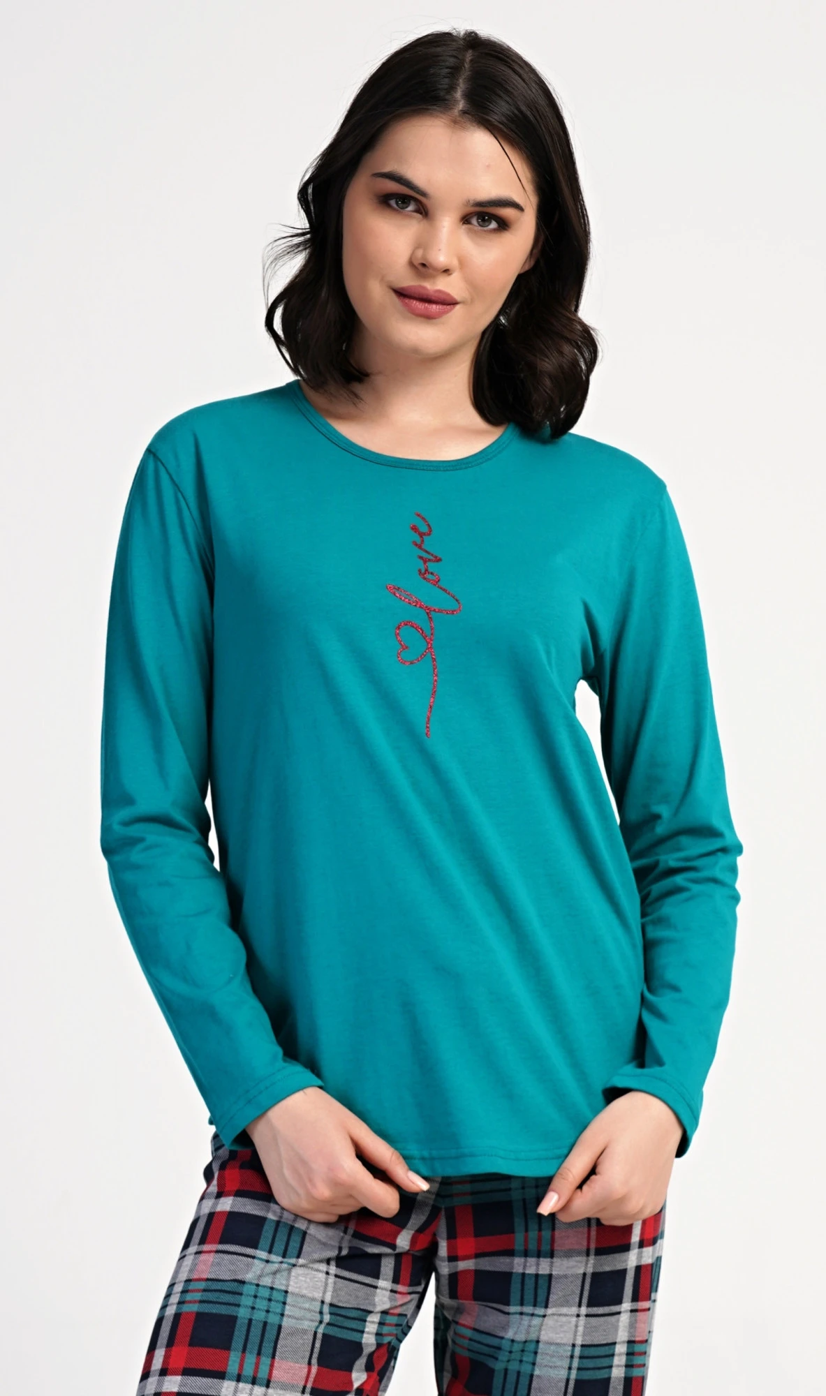 Dámské bavlněné dlouhé pyžamo Love. Dámské pyžamo se skládá z trika s dlouhým rukávem a dlouhých kalhot. Triko je jednobarevné, zdobené nápisem LOVE. Kárované kalhoty mají v pase gumu a šňůrku na stažení, nemají kapsy. Použitý bavlněný materiál je poddajný a příjemný na dotek.