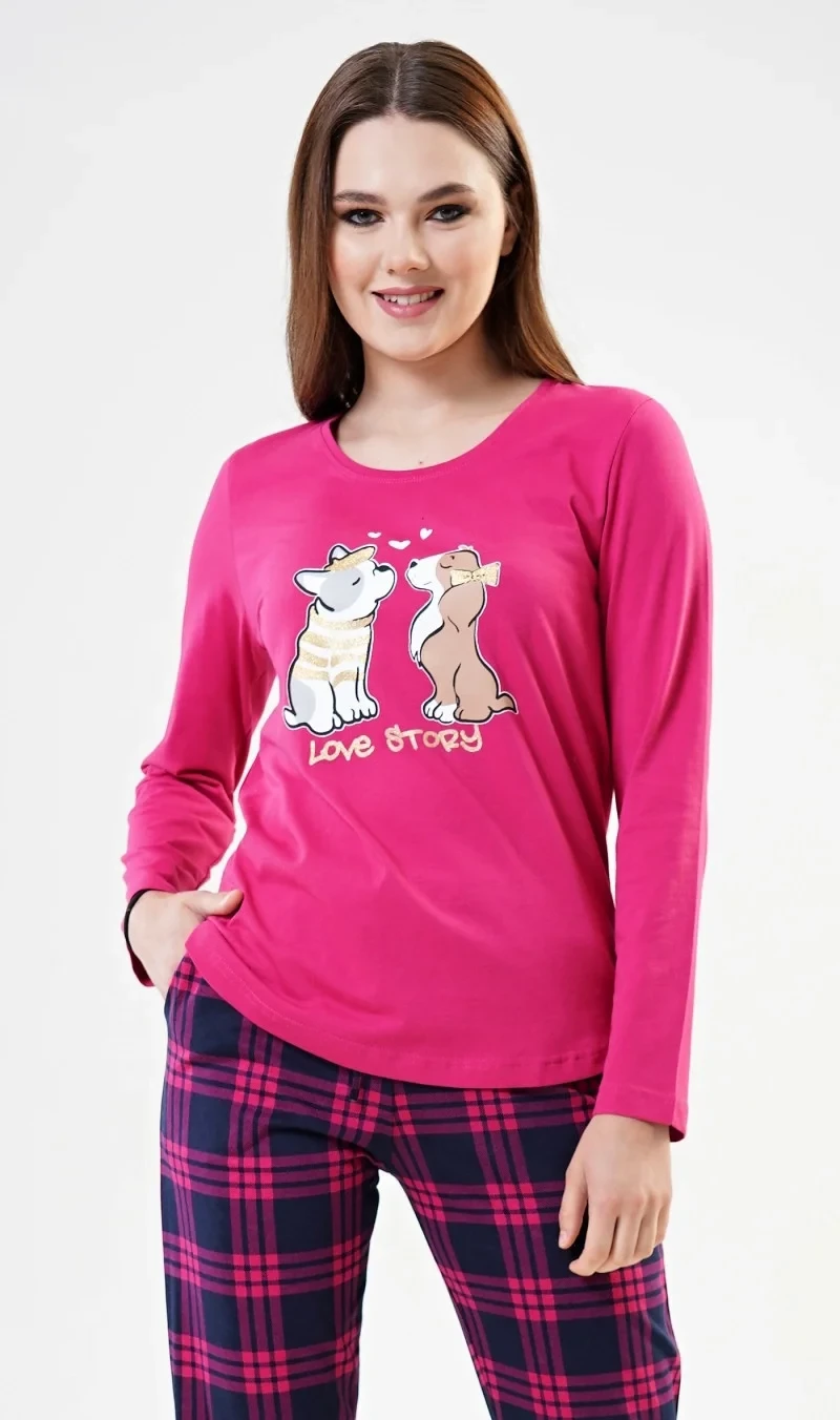 Dámské bavlněné pyžamo dlouhé Love story. Dámské pyžamo se skládá z trička s dlouhým rukávem a dlouhých kalhot. Triko je jednobarevné, zdobené potiskem dvou zamilovaných psů a nápisem Love story. Kalhoty mají gumu, šňůrku na stáhnutí a praktické kapsy. Použitý bavlněný materiál je poddajný a příjemný na dotek.