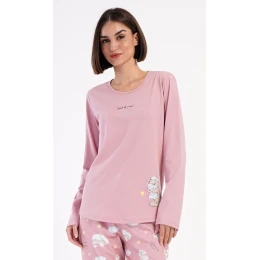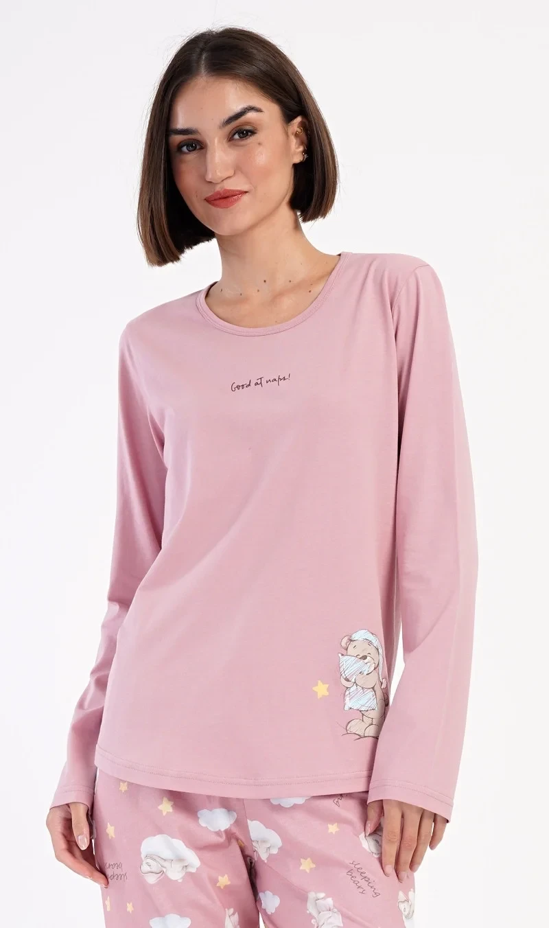 Dámské bavlněné dlouhé pyžamo Méďa s polštářem. Dámské pyžamo se skládá z trika s dlouhým rukávem a dlouhých kalhot. Triko je jednobarevné, zdobené obrázkem medvídka s polštářem. Obrázky medvídků se opakují i na kalhotách, které mají v pase gumu a šňůrku na stažení, nemají kapsy. Použitý bavlněný materiál je poddajný a příjemný na dotek.
