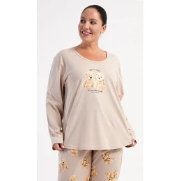 Dámské bavlněné dlouhé pyžamo Méďové. Dámské pyžamo se skládá z trika s dlouhým rukávem a dlouhých kalhot. Triko s kulatým výstřihem je na hrudi zdobeno obrázkem plyšových medvědů. Tento motiv se opakuje i na kalhotách, které mají v pase gumu a šňůrku na stažení, nemají kapsy. Použitý bavlněný materiál je poddajný a příjemný na dotek.
