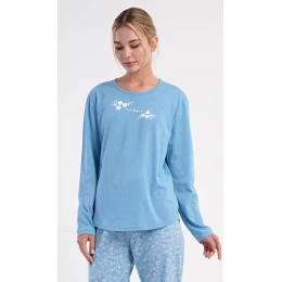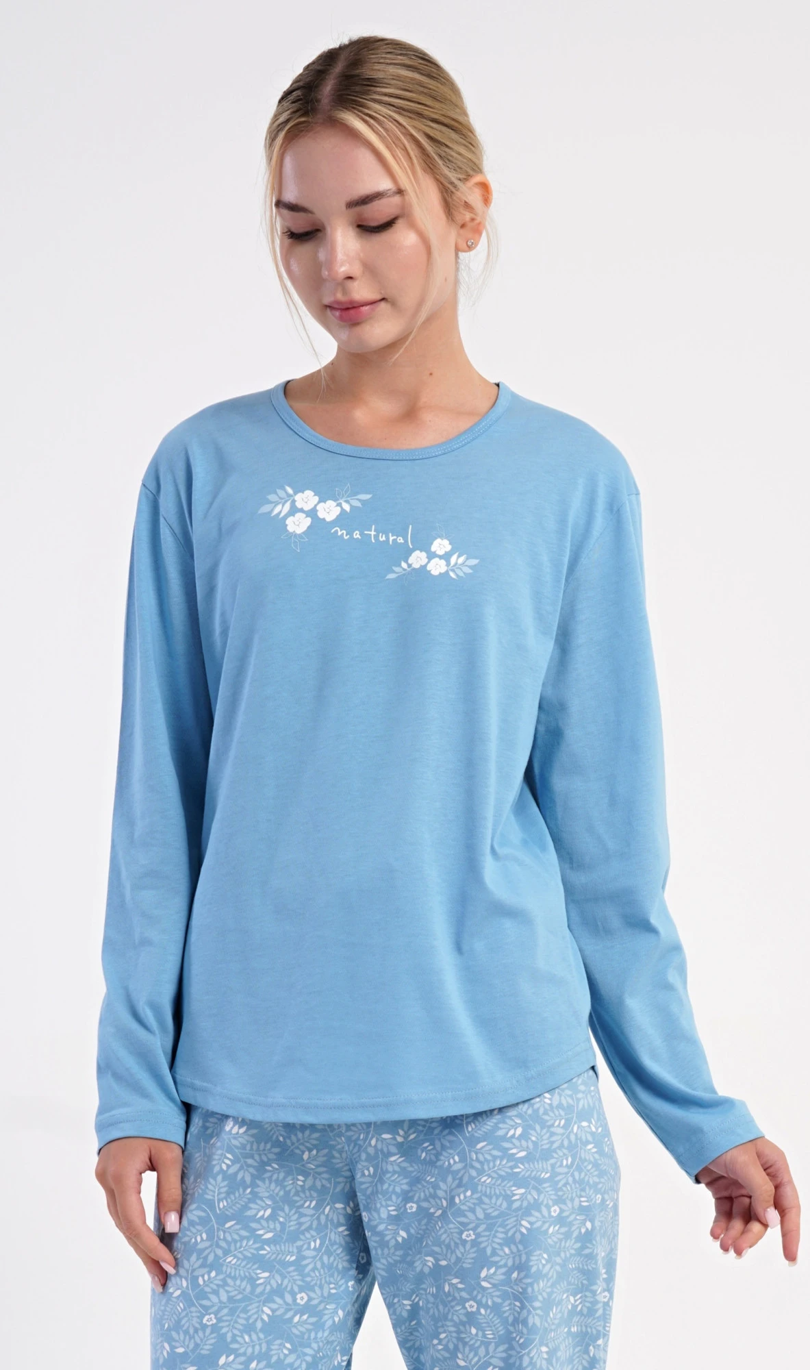 Dámské bavlněné dlouhé pyžamo Natural life. Dámské pyžamo se skládá z trika s dlouhým rukávem a dlouhých kalhot. Jednobarevné triko je ozdobeno obrázkem květů a větviček. Tento motiv se opakuje i na kalhotách, které mají v pase gumu a šňůrku na stažení, nemají kapsy. Použitý bavlněný materiál je poddajný a příjemný na dotek.