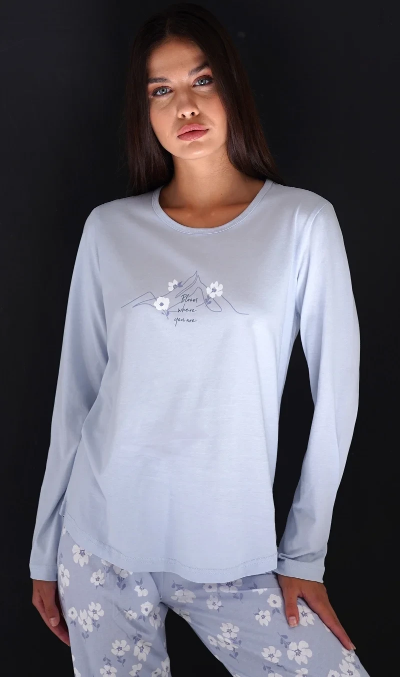 Dámské bavlněné dlouhé pyžamo Nature. Dámské pyžamo se skládá z trika s dlouhým rukávem a dlouhých kalhot. Triko je jednobarevné, zdobené obrázkem s květinovým motivem. Květinový potisk se opakuje i na kalhotách, které mají v pase gumu a šňůrku na stažení, nemají kapsy. Použitý bavlněný materiál je poddajný a příjemný na dotek.