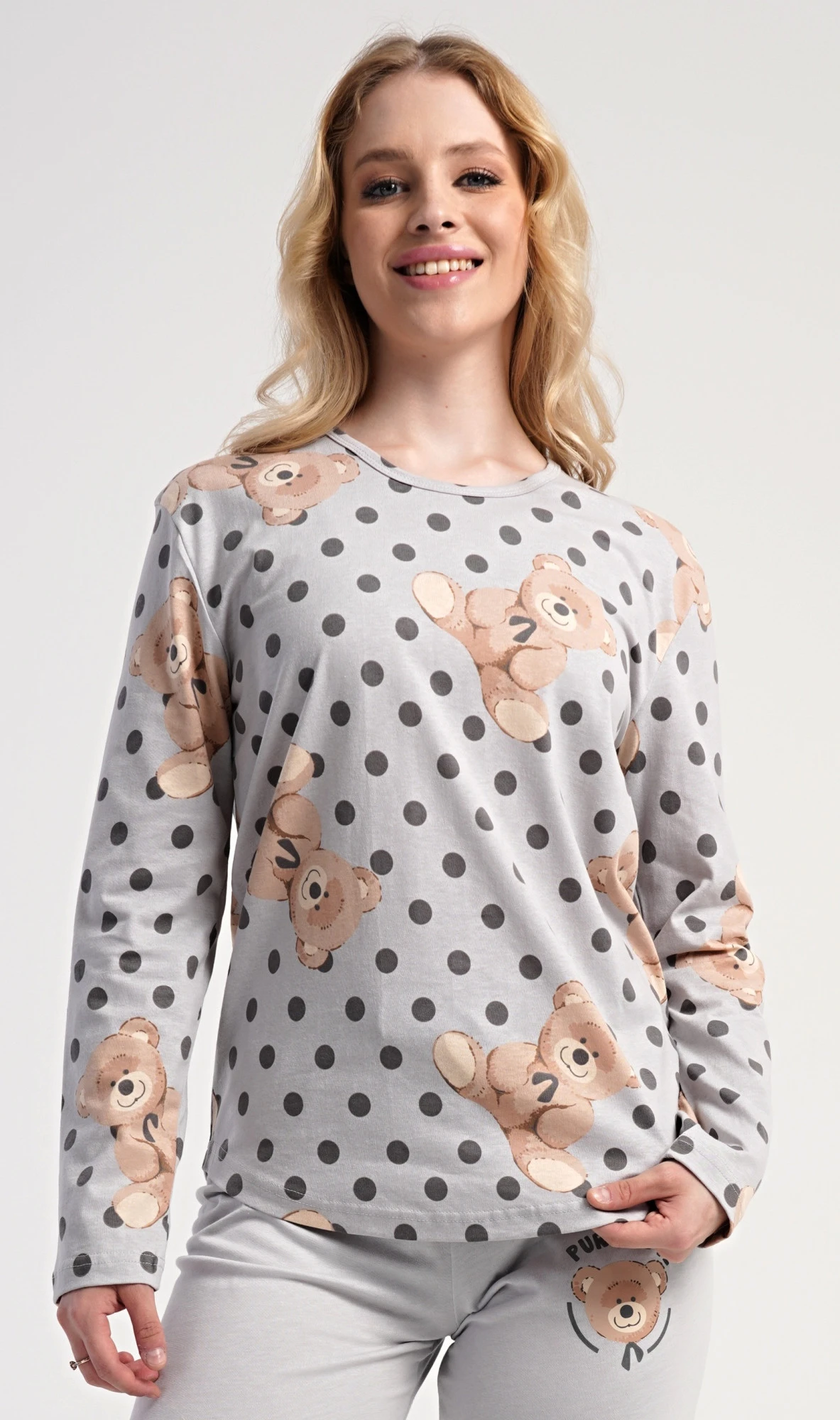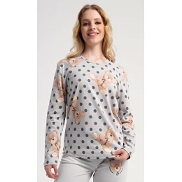 Dámské bavlněné dlouhé pyžamo Paula. Dámské pyžamo se skládá z trika s dlouhým rukávem a dlouhých kalhot. Jednobarevné triko je ozdobeno obrázkem medvědů. Tento motiv se opakuje i na kalhotách, které mají v pase gumu a šňůrku na stažení, nemají kapsy. Použitý bavlněný materiál je poddajný a příjemný na dotek.