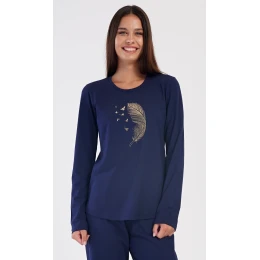 Dámské bavlněné dlouhé pyžamo Peří. Dámské pyžamo se skládá z trika s dlouhým rukávem a dlouhých kalhot. Triko je jednobarevné, zdobené obrázkem pírka ve zlaté barvě. Pyžamové dlouhé kalhoty mají v pase gumu a šňůrku na stažení, nemají kapsy. Nohavice jsou zakončeny patenty. Použitý bavlněný materiál je poddajný a příjemný na dotek.