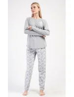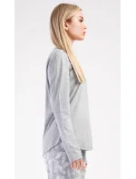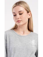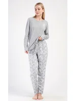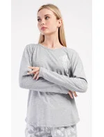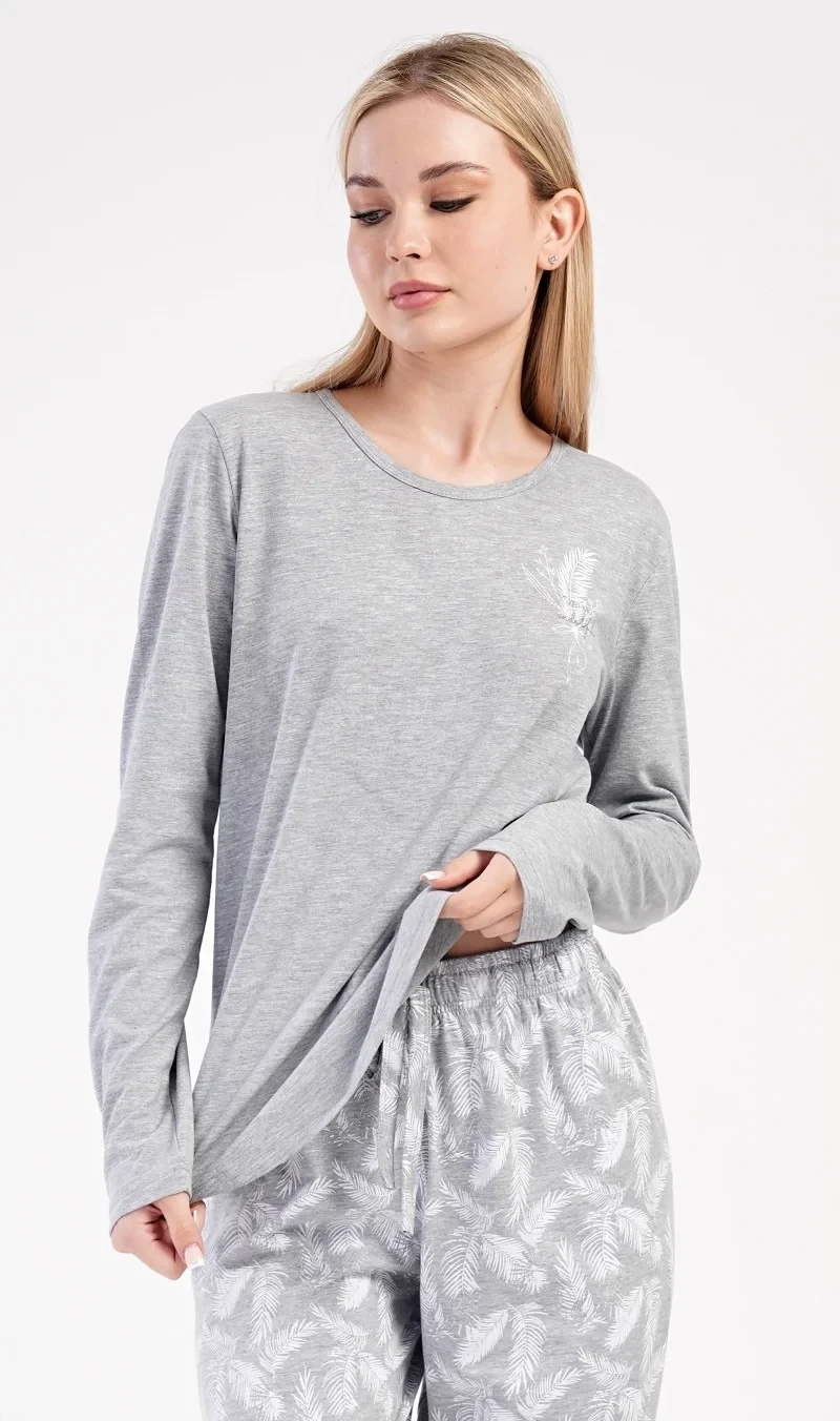 Dámské dlouhé pyžamo Peříčko. Dámské pyžamo se skládá z trika s dlouhým rukávem a dlouhých kalhot. Triko je jednobarevné, zdobené obrázkem peříčka. Motiv peří se opakuje i na kalhotách, které mají v pase gumu a šňůrku na stažení, nemají kapsy. Použitý materiál s obsahem bavlny 80% je poddajný a příjemný na dotek.