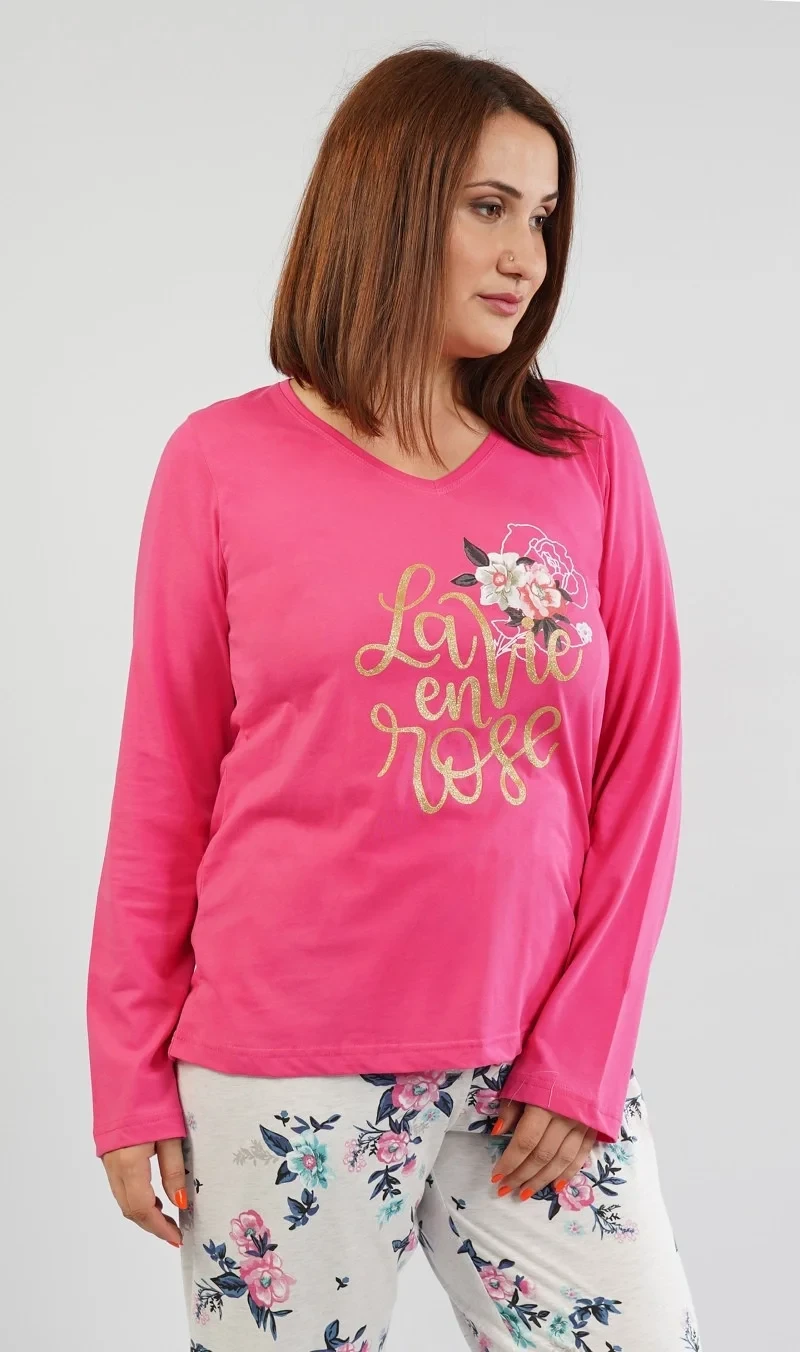 Dámské pyžamo dlouhé Rose. Dámské pyžamo se skládá z trika s dlouhým rukávem a dlouhých kalhot. Na jednobarevném triku je zlatý nápis 'La Vie en Rose' doplněný obrázkem růže. Motiv růže se opakuje i na dlouhých kalhotách, které mají v pase gumu a šňůrku na stažení, nemají kapsy. Použitý materiál je poddajný a příjemný na dotek. Triko je složeno ze 100% bavlnou, kalhoty mají obsah bavlny 100%.