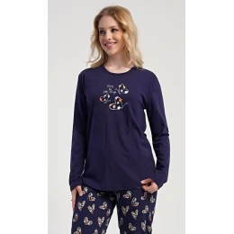 Dámské bavlněné dlouhé pyžamo Sarah. Dámské pyžamo se skládá z trika s dlouhým rukávem a dlouhých kalhot. Jednobarevné triko je ozdobeno obrázkem květů a motýlů. Květinový motiv se opakuje i na kalhotách, které mají v pase gumu a šňůrku na stažení, nemají kapsy. Použitý bavlněný materiál je poddajný a příjemný na dotek.