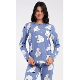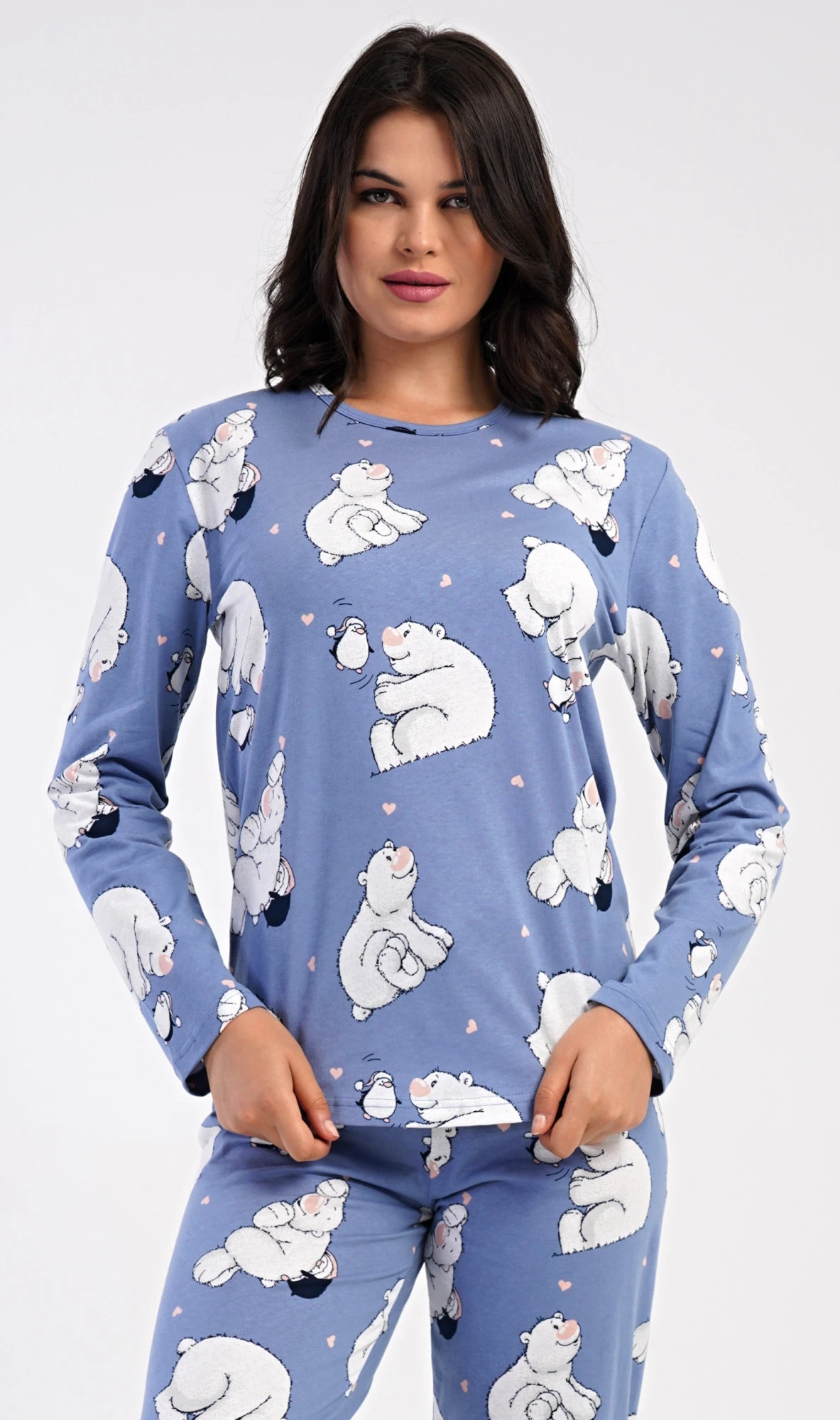 Dámské bavlněné dlouhé pyžamo Tučňák a méďa. Dámské pyžamo se skládá z trika s dlouhým rukávem a dlouhých kalhot. Triko s kulatým výstřihem je ozdobeno obrázky ledních medvědů. Tento motiv se opakuje i na kalhotách, které mají v pase gumu a šňůrku na stažení, nemají kapsy. Použitý bavlněný materiál je poddajný a příjemný na dotek.