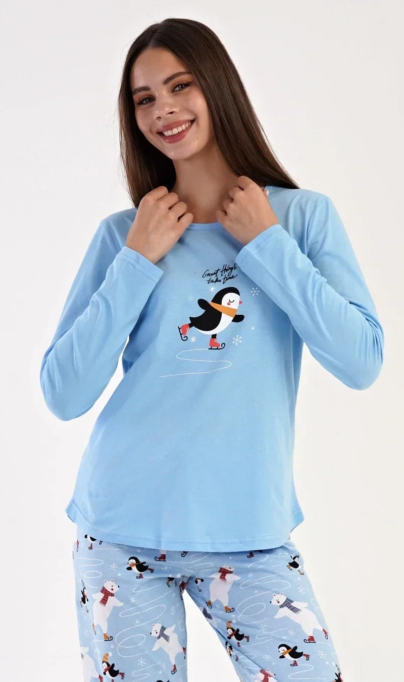 Dámské pyžamo dlouhé Tučňák na ledě. Dámské pyžamo se skládá z trika s dlouhým rukávem a dlouhých kalhot. Triko je jednobarevné, zdobené drobným nápisem a obrázkem tučňáka. Kalhoty jsou světle modré, potištěné bruslícími tučňáky a medvědy. Kalhoty mají v pase gumu a šňůrku na stažení. Modré triko je složeno ze 100% bavlnou, šedé má obsah bavlny 70%. Kalhoty jsou čistě bavlněné. Použitý materiál je poddajný a jemný na dotek.
