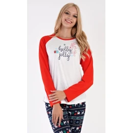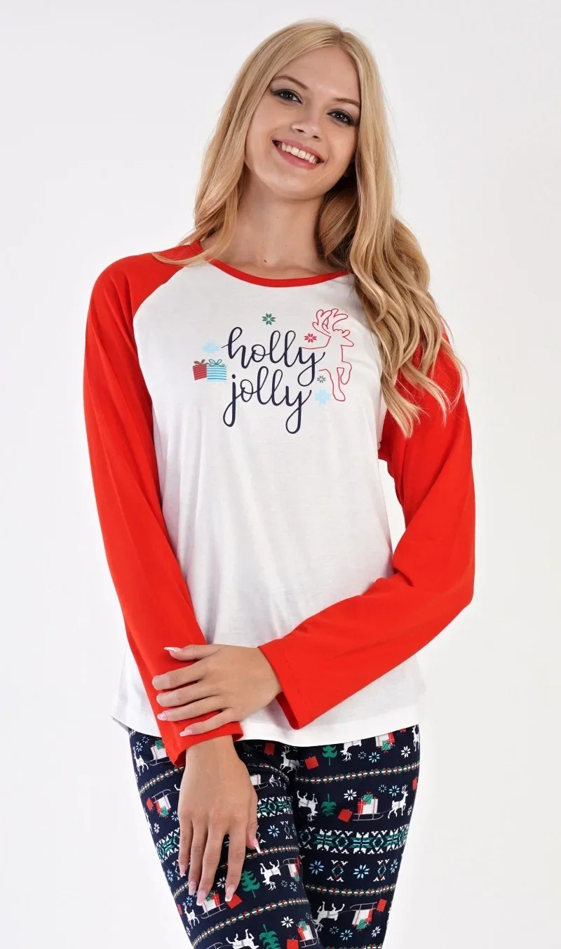 Dámské bavlněné pyžamo dlouhé Vánoční dárek. Dámské pyžamo se skládá z trika s dlouhým rukávem a dlouhých kalhot. Triko je ozdobené nápisem HOLLY JOLLY a obrázky vánočních dárků. Kalhoty jsou potištěné vánočními motivy. Kalhoty mají v pase gumu, šňůrku na stažení a jsou zakončené lemy. Použitý materiál je poddajný a jemný na dotek. Kalhoty i triko je složeno ze 100% bavlnou.