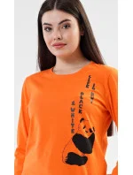 Dámské bavlněné dlouhé pyžamo Včelka. Dámské pyžamo se skládá z trika s dlouhým rukávem a dlouhých kalhot. Triko s kulatým výstřihem je na hrudi zdobeno obrázkem včelky. Tento motiv se opakuje i na kalhotách, které mají v pase gumu a šňůrku na stažení, nemají kapsy. Použitý bavlněný materiál je poddajný a příjemný na dotek.