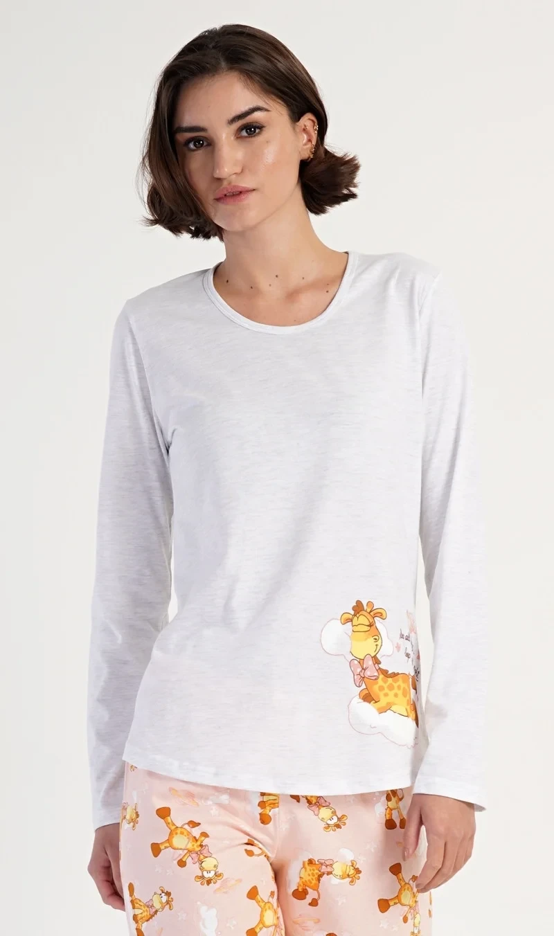 Dámské pyžamo dlouhé Žirafa. Dámské pyžamo se skládá z trika s dlouhým rukávem a dlouhých kalhot. Triko je jednobarevné, zdobené drobným nápisem a obrázkem spící žirafky. Stejný motiv se opakuje i na kalhotách, které mají v pase gumu a šňůrku na stažení, nemají kapsy. Světle šedé triko je složeno ze 70-ti % bavlnou, kalhoty jsou čistě bavlněné. Použitý materiál je poddajný a příjemný na dotek.