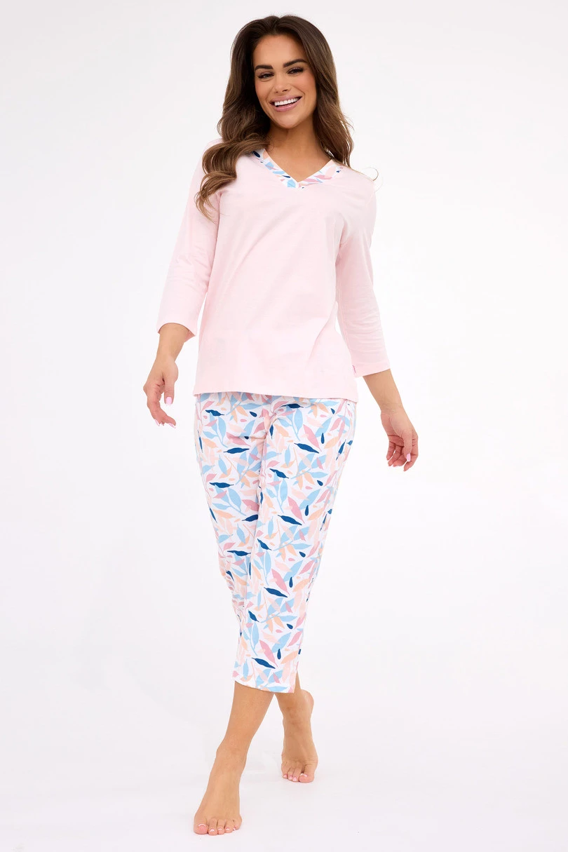 Dámské pyžamo Cornette DR 389/455 Nancy je kombinací třídy a pohodlí v té nejlepší kvalitě. Soupravu tvoří pevný top s 3/4 rukávy a srdíčkovým výstřihem, jemně lemovaný ozdobným lemem – decentní detail, který dodává eleganci. Soupravu doplňují vzorované kalhoty ve 3/4 délce ze stejné přírodní bavlny, které zaručují prodyšnost a pohodlí po celou noc. Pyžamo je zabaleno v elegantní krabičce – skvělý nápad na dárek.