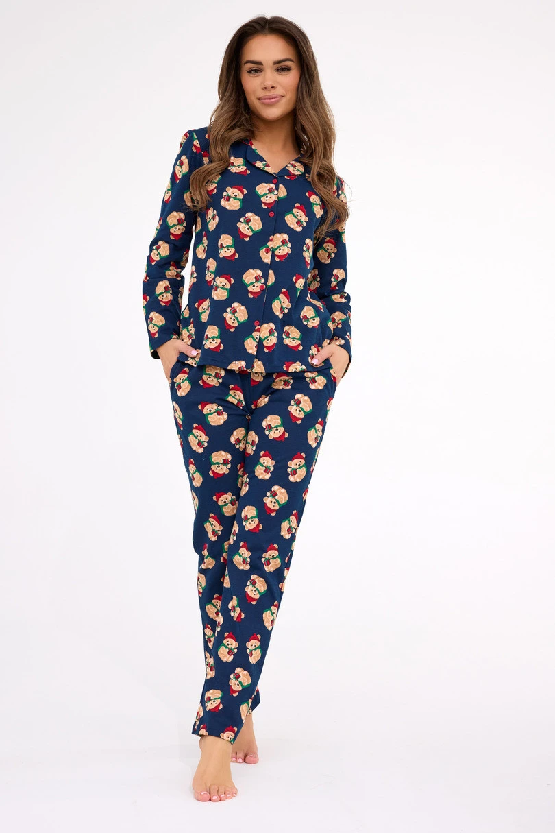 Urocza piżama damska DR 482/459 Teddy 5 z kolekcji Świątecznej to idealny wybór na zimowe noce i świąteczny czas. Wykonana w 100% z wysokiej jakości, miękkiej bawełny, zapewnia ciepło, komfort i pełną swobodę ruchów. Góra piżamy to klasyczna bluza z długim rękawem, zapinana na guziki, z eleganckim kołnierzykiem i świątecznym printem, który wprowadza w magiczny nastrój Bożego Narodzenia. Do kompletu dołączono długie spodnie z elastyczną gumką w pasie, obszytą bawełną, które gwarantują wygodę i idealne dopasowanie. To doskonały zestaw do spania lub wieczornego relaksu w domowym cieple – również świetny pomysł na prezent.