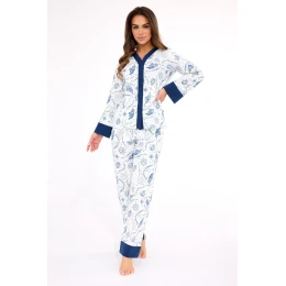 Piżama damska AMBER DR 514/443 to stylowy i komfortowy komplet idealny na każdą porę roku. Wykonana w 100% z miękkiej, oddychającej bawełny, zapewnia wygodę podczas snu i relaksu w domu. Rozpinana bluzka z długim rękawem wykonana z wzorzystej tkaniny prezentuje się kobieco i elegancko. Do kompletu dołączone są długie spodnie z prostymi nogawkami i praktycznymi kieszeniami, które gwarantują pełną swobodę ruchu. Piżama zapakowana w estetyczne pudełko – doskonały pomysł na prezent.