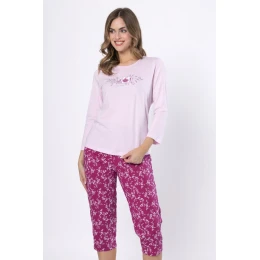 EDYTA 1633 marki Leveza to komfortowa piżama damska stworzona z myślą o kobietach ceniących wygodę i delikatny styl. Wykonana w 100% z naturalnej bawełny, zapewnia maksymalny komfort podczas snu i relaksu. Górna część to bluzka z okrągłym dekoltem, rękawem 7/8 oraz subtelnym nadrukiem kwiatowym na tle koloru lilaróż. Spodnie 3/4 w intensywnym odcieniu amarantu zdobi roślinny wzór z motywem listków, który nadaje całości nowoczesnego charakteru. Lekki i oddychający komplet dostępny jest w rozmiarach od M do 2XL – idealny wybór na każdą porę roku.
