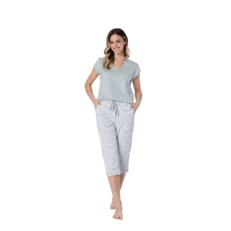 Kalhoty s 3/4 délkou zajišťují volnost pohybu a pohodlí při spánku a domácím odpočinku. Model je vybaven praktickými kapsami a regulací pasu pomocí šňůrky. Květinový vzor s motivem palmových listů dodává pyžamu módní letní styl.