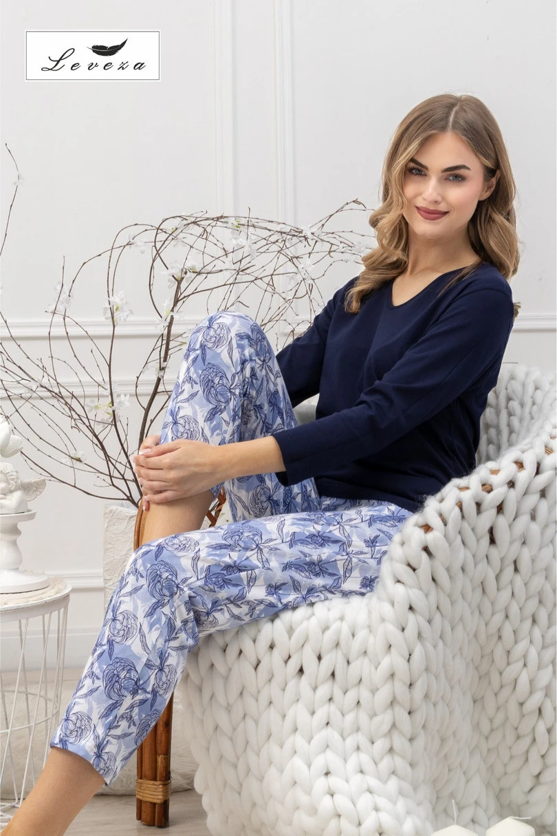 Piżama damska LEVEZA ELWIRA 1660 to model premium stworzony z myślą o kobietach, które cenią komfort, jakość i subtelną elegancję. Wykonana ze 100% uszlachetnionej bawełny, zapewnia doskonałą przewiewność i miękkość w dotyku. Bluzka z dekoltem w serek i rękawem o długości 7/8 utrzymana jest w klasycznym granatowym kolorze i pozbawiona zbędnych ozdób – minimalistyczna i stylowa. Spodnie o długości 7/8 w kolorze jeansowym zdobi delikatny kwiatowy wzór oraz subtelna atłasowa kokardka w pasie. Dostępna w rozmiarach M–2XL, piżama doskonale sprawdzi się na każdą porę roku.