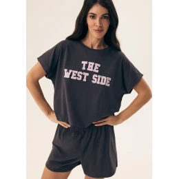 Dámské pyžamo od značky Esotiq v nadčasovém stylu pro všechny, kdo zakládají na každodenním pohodlí. Pyžamo se skládá z kratšího trička a šortek, které spolu tvoří pohodlný a stylový komplet ideální na spaní i domácí pohodu. Tričko s krátkým rukávem má na přední straně pogumovaný nápis, šortky jsou v pase na pohodlnou pružnou gumu. Díky bavlněnému materiálu je pyžamo velmi měkké a příjemné na dotek.