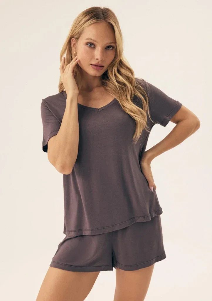 Dámské letní pyžamo značky Henderson vyrobené z velmi měkkého a příjemného materiálu, který zajišťuje maximální pohodlí při nošení. Pyžamo se skládá z volnějšího trička s krátkým rukávem a výstřihem do V a šortek s pohodlnou širší gumou v pase. Díky volnému střihu je ideální pro klidný spánek i domácí pohodu.
