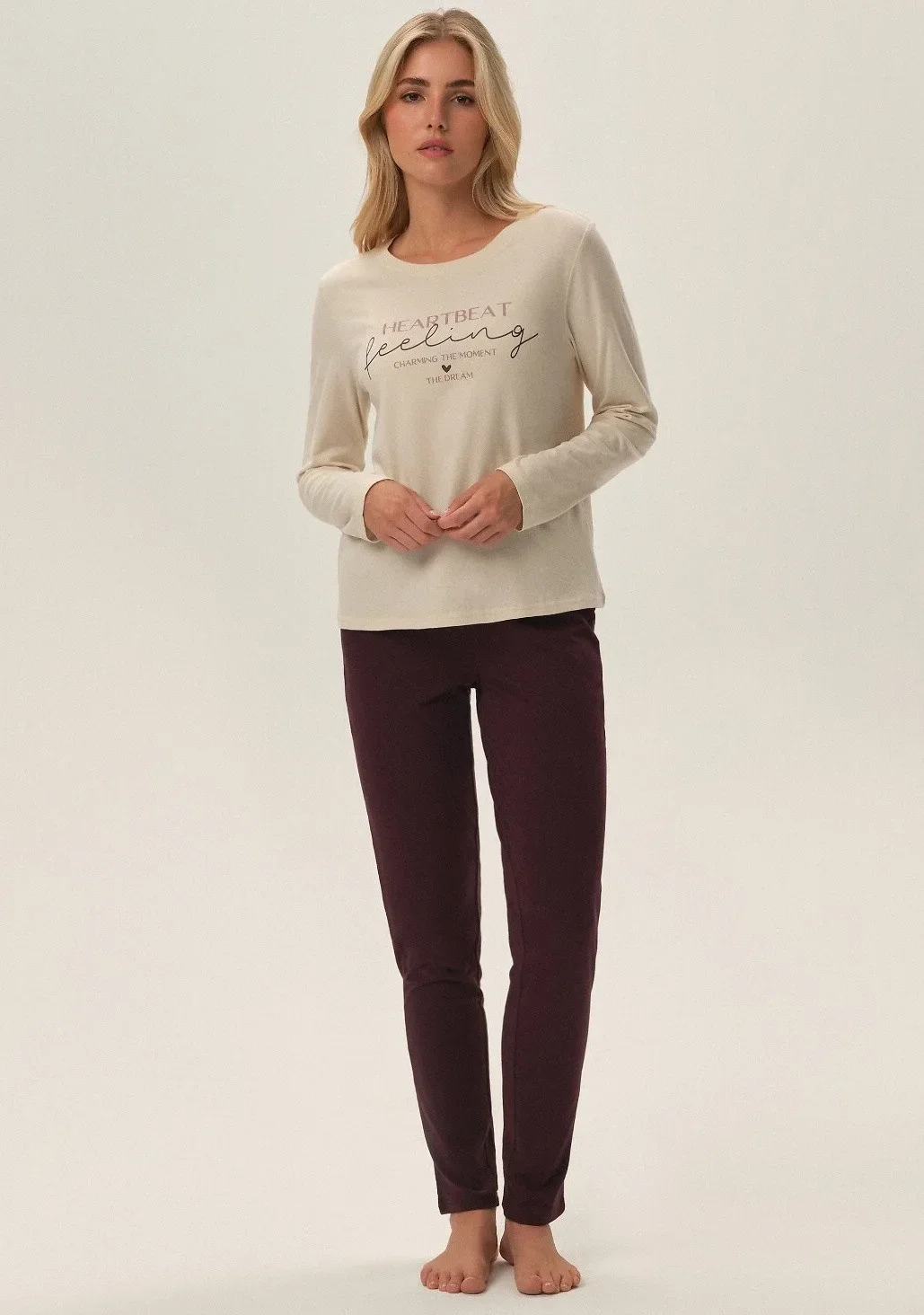 Dámské bavlněné pyžamo od značky Henderson. Vrchní díl pyžama má dlouhé rukávy, kulatý výstřih a přední část je ozdobena potiskem. Kalhoty jsou dlouhé, v pase do gumy a jsou bez úpletů..