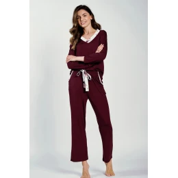 Dámské pyžamo s 3/4 rukávy, výstřihem do V, lemované kontrastní látkou, 7/8 nohavicemi s rovnými nohavicemi a kapsami, ozdobnou šňůrkou v pase.