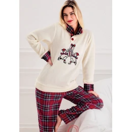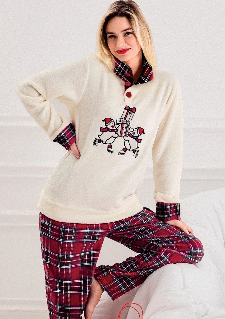 Užijte si zimní večery v maximálním pohodlí s dámským pyžamem, které je součástí oblíbené vánoční kolekce. Tento model je vyroben z extrémně hebkého a teplého coral fleece materiálu, díky kterému je ideální pro chladné dny i dlouhé zimní noci. Pyžamo je ušité ze 100% polyesterového coral fleecu, který je sametově jemný, neelektrizuje a perfektně drží teplo. Pocitově připomíná hebký plyš — ideální pro ženy, které milují maximální komfort. Model zdobí hravý vánoční motiv na vrchním dílu a stylové zimní vzory na kalhotách. Pyžamo působí mile, přitom vkusně, a krásně dokreslí domácí atmosféru během celého adventu i Vánoc. Kabátek má u krku knoflíčky pro snadné oblékání. Rukávy jsou ukončené manžetami pro dobré držení rukávů. Dlouhé kalhoty s manžetami drží tvar a nevyhrnují se. V pase jdou do pružné pohodlné gumy.