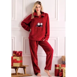 Dámské domácí pyžamo Infiore v sytě červené barvě je ideální volbou na zimní období i vánoční pohodu. Je vyrobené z velmi měkkého a hřejivého „teddy“ materiálu, který příjemně zahřeje a zajišťuje maximální komfort. Vrchní díl má límeček se zapínáním na knoflíky a na přední straně zdobí roztomilá výšivka dvou pejsků v autíčku. Kalhoty mají pohodlný volný střih a elastický pas. Skvělý set pro odpočinek doma, zimní večery i jako milý dárek.