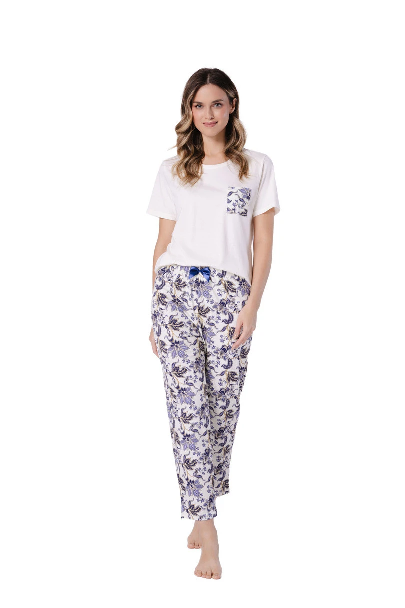Kalhoty v délce 7/8 nabízejí pohodlí a volnost pohybu, květinový vzor dodává soupravě ženský nádech a ozdobná mašle v pase umocňuje její jemný vzhled. Kombinace světlého topu a tmavě modrých akcentů vytváří harmonický, elegantní celek.