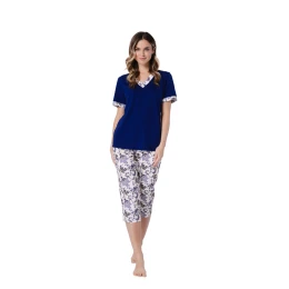Dámské pyžamo Izabela 1738 značky Leveza je elegantní a pohodlnou nabídkou pro ženy, které ocení klasický styl v moderním vydání. Je vyrobeno ze 100% zušlechtěné bavlny, je výjimečně měkké, hladké a příjemné k pokožce a zároveň zajišťuje vynikající prodyšnost. Halenka s krátkými rukávy zakončenými manžetou a srdíčkovým výstřihem byla ozdobena kontrastními detaily, které celku dodávají elegantní charakter. 3/4 dlouhé kalhoty v barvě ecru a tmavě modré se vyznačují jemným květinovým vzorem a celek skvěle doplňují. Jedná se o ideální pyžamo pro jarně-letní sezónu, které v sobě spojuje pohodlí s nadčasovou estetikou.