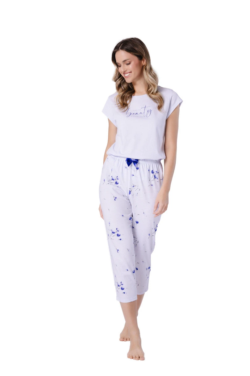 Dámské pyžamo Kajra 1734 značky Leveza je stylovou a pohodlnou volbou pro ženy, které u svého nočního prádla ocení pohodlí a moderní vzhled. Je vyrobeno ze 100% přírodní bavlny, je měkké, prodyšné a šetrné k pokožce, což zaručuje pohodlí po celou noc. Halenku s krátkým rukávem a klasickým kulatým výstřihem zdobí módní potisk s nápisem, který celku dodává lehce ležérní nádech. 7/8 dlouhé kalhoty v inkoustově modré barvě mají květinový vzor a ozdobnou mašli v pase. Jedná se o ideální pyžamo pro jarně-letní sezónu, které kombinuje funkčnost s ženským stylem.