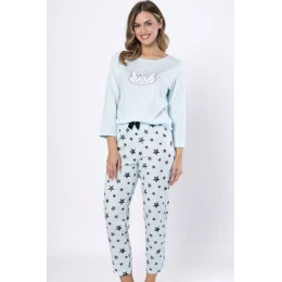 Piżama KAMILA 1642 marki Leveza to doskonałe połączenie wygody i subtelnej kobiecości. Wykonana w 100% z naturalnej bawełny, zapewnia miękkość, przewiewność i komfort przez całą noc. Górna część to bluzka z okrągłym dekoltem, rękawem 7/8 oraz uroczym nadrukiem łabędzi na tle koloru baby blue. Spodnie o długości 7/8 utrzymane są w tej samej tonacji i ozdobione nieregularnym wzorem gwiazdek, z dodatkiem dekoracyjnej kokardki w pasie. Całość tworzy spójny, harmonijny zestaw idealny na każdą porę roku. Dostępna w rozmiarach od S do 2XL.