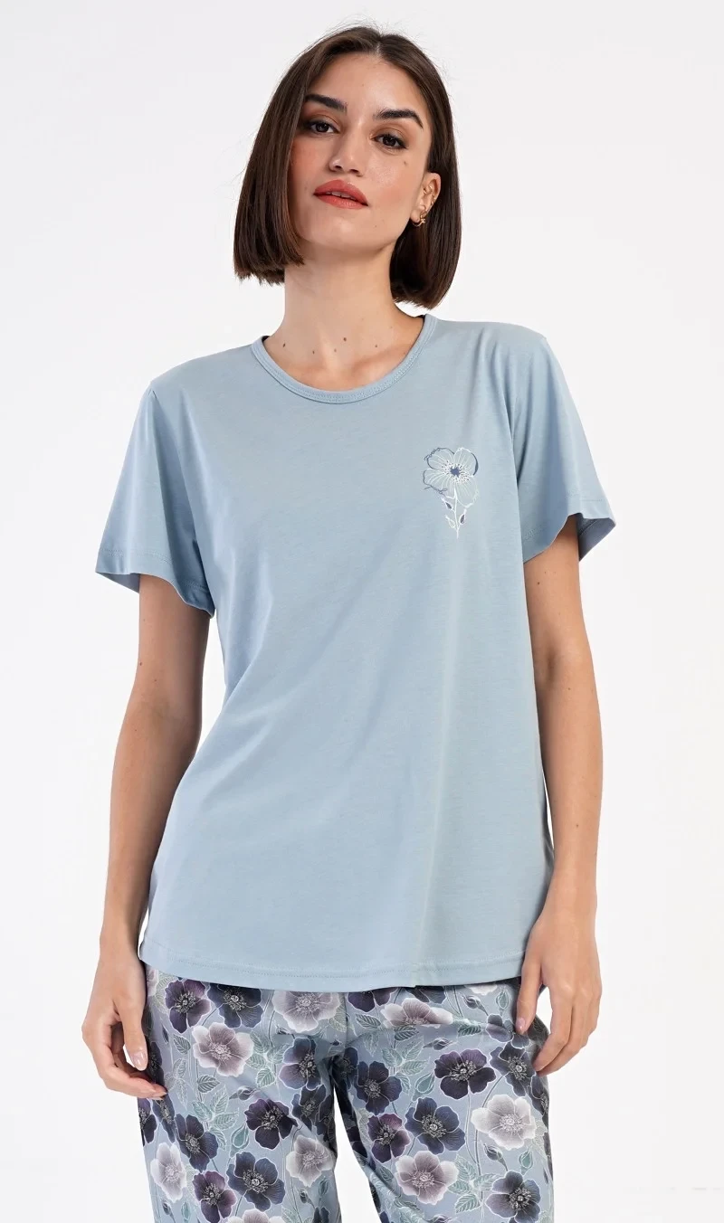 Dámské bavlněné kapri pyžamo Agnes. Dámské pyžamo se skládá z trička s krátkým rukávem a tříčtvrtečních kalhot. Tričko s kulatým výstřihem má na hrudi obrázek květu. Tento motiv se opakuje i na kalhotách, které mají v pase gumu a šňůrku na stažení, jsou bez kapes. Použitý bavlněný materiál je příjemný a poddajný na dotek.