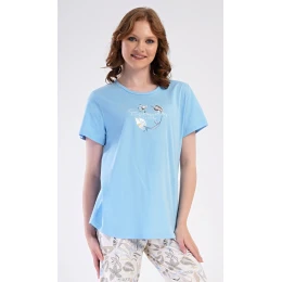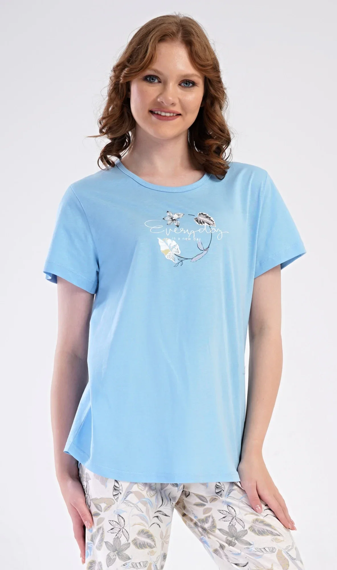 Dámské bavlněné kapri pyžamo Alex. Dámské pyžamo se skládá z trička s krátkým rukávem a tříčtvrtečních kalhot. Tričko s kulatým výstřihem zdobí na hrudi decentní obrázek a nápis 'Everyday'. Motiv květů a listů se opakuje i na kalhotách, které mají v pase gumu a šňůrku na stažení, jsou bez kapes. Použitý bavlněný materiál je příjemný a poddajný na dotek.