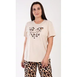 Dámské bavlněné kapri pyžamo Beautiful. Kapri pyžamo se skládá z trička s krátkým rukávem a tříčtvrtečních kalhot. Tričko s kulatým výstřihem má na hrudi potisk ve tvaru srdce a nápis 'Beautiful', kalhoty jsou potištěny leopardím vzorem. Kapri kalhoty mají v pase gumu a šňůrku na stáhnutí, nemají kapsy. Použitý materiál je příjemný a poddajný na dotek. Obsah bavlny u trička i u kalhot je 100%.