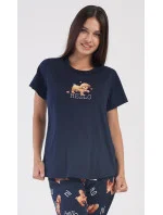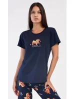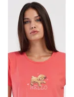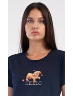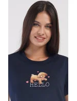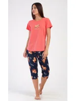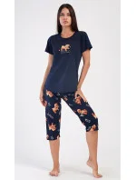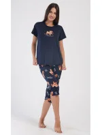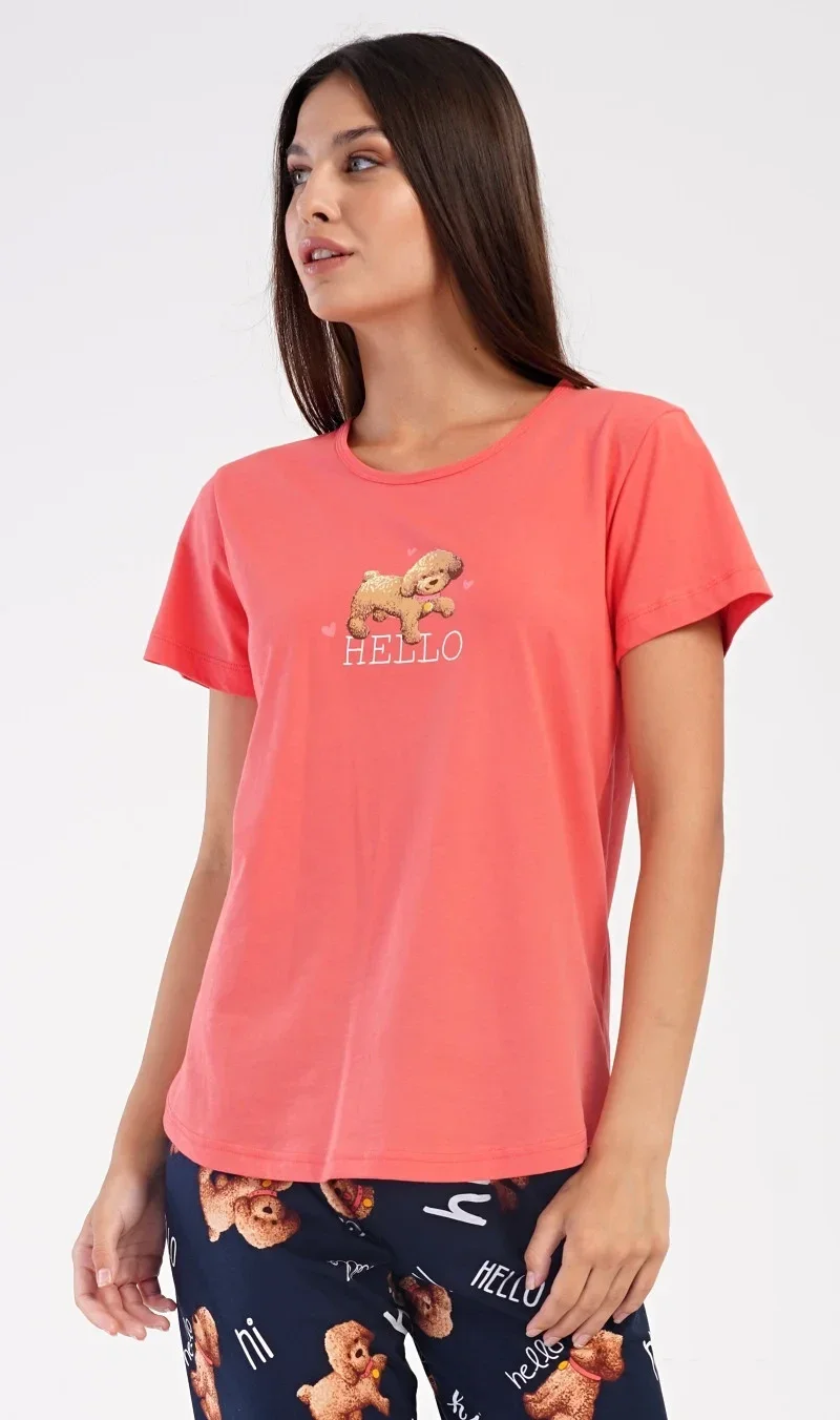 Dámské bavlněné kapri pyžamo Dominika. Dámské pyžamo se skládá z trička s krátkým rukávem a tříčtvrtečních kalhot. Tričko s kulatým výstřihem má na hrudi obrázek pejska a nápis HELLO. Tento motiv se opakuje i na kalhotách, které mají v pase gumu a šňůrku na stažení, jsou bez kapes. Použitý bavlněný materiál je příjemný a poddajný na dotek.