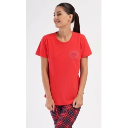 Dámské bavlněné kapri pyžamo Kateřina. Dámské pyžamo se skládá z trička s krátkým rukávem a tříčtvrtečních kalhot. Tričko s kulatým výstřihem má na hrudi obrázek srdíčka a nápis 'Looks gorgeous'. Kárované kalhoty mají v pase gumu a šňůrku na stažení, jsou bez kapes. Použitý bavlněný materiál je příjemný a poddajný na dotek.