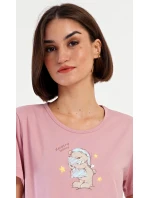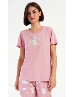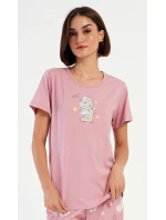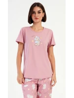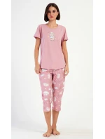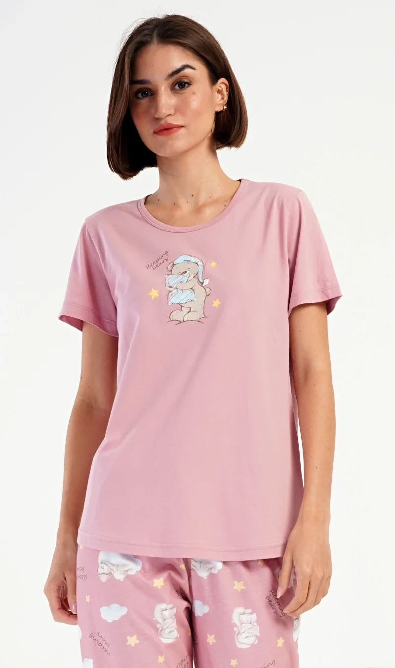 Dámské bavlněné kapri pyžamo Méďa s polštářem. Dámské pyžamo se skládá z trička s krátkým rukávem a tříčtvrtečních kalhot. Tričko s kulatým výstřihem má na hrudi obrázek medvídka s polštářem a čepičkou. Tento motiv se opakuje i na kalhotách, které mají v pase gumu a šňůrku na stažení, jsou bez kapes. Použitý bavlněný materiál je příjemný a poddajný na dotek.