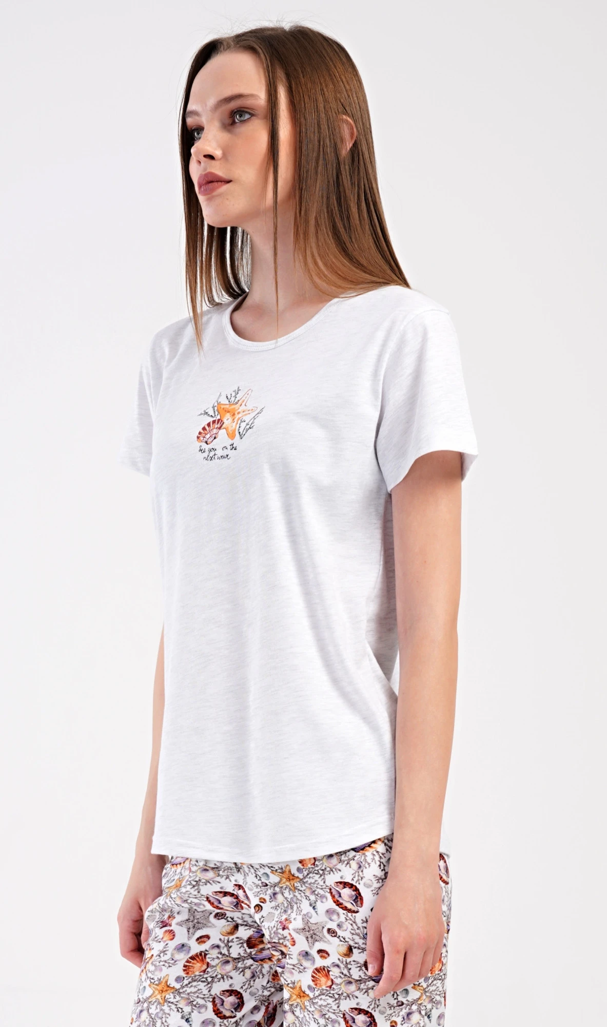 Dámské kapri pyžamo Moře. Dámské pyžamo se skládá z trička s krátkým rukávem a tříčtvrtečních kalhot. Tričko s kulatým výstřihem zdobí na hrudi obrázek s mořským motivem. Tento motiv se opakuje i na kalhotách, které mají v pase gumu a šňůrku na stažení, jsou bez kapes. Použitý materiál s obsahem bavlny 70% je příjemný a poddajný na dotek.