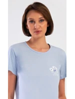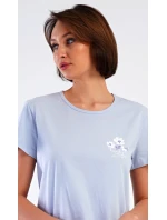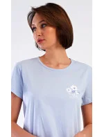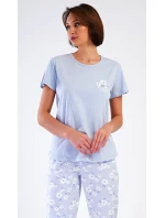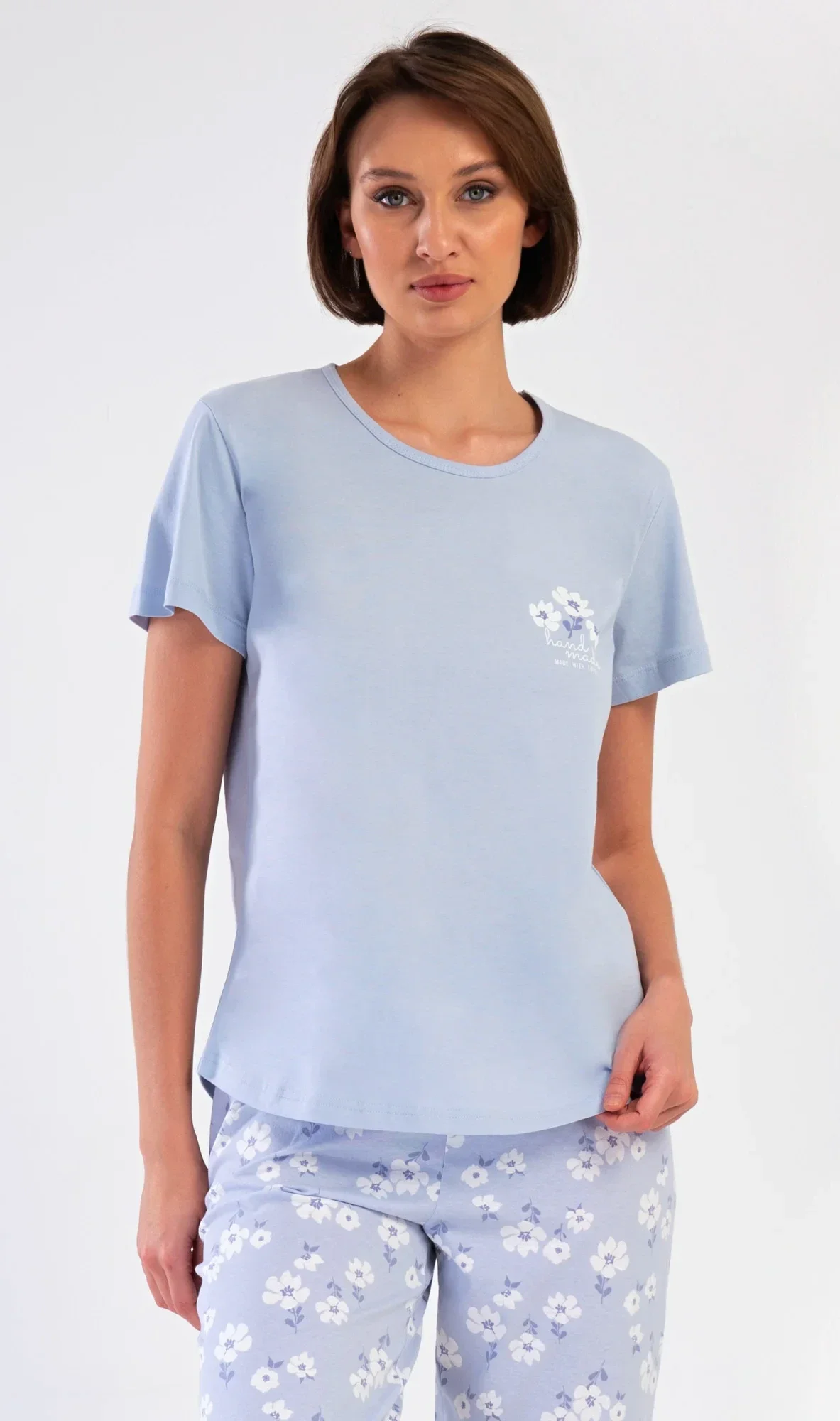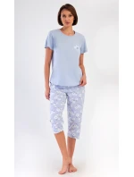 Dámské bavlněné kapri pyžamo Nature. Dámské pyžamo se skládá z trička s krátkým rukávem a tříčtvrtečních kalhot. Tričko s kulatým výstřihem má na hrudi obrázek květu. Tento motiv se opakuje i na kalhotách, které mají v pase gumu a šňůrku na stažení, jsou bez kapes. Použitý bavlněný materiál je příjemný a poddajný na dotek.