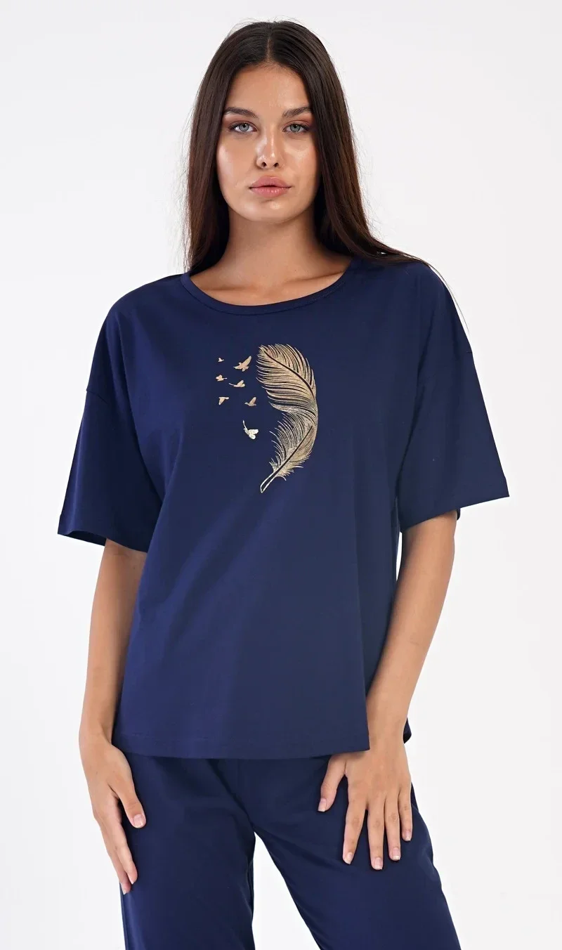 Dámské bavlněné kapri pyžamo Pírko. Dámské pyžamo se skládá z trička s krátkým spadeným rukávem a tříčtvrtečních kalhot zakončených lemy. Tričko s kulatým výstřihem má na hrudi obrázek zlatého peří. Kalhoty mají v pase gumu a šňůrku na stažení, jsou bez kapes. Použitý bavlněný materiál je příjemný a poddajný na dotek.